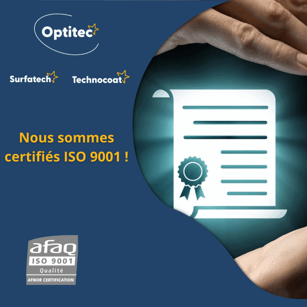 ✅ Nous sommes fiers d’annoncer que le Groupe OPTITEC, comprenant le siège social OPTITEC ainsi que nos ateliers de production SURFATECH (Vendargues) et TECHNOCOAT (Chassieu), vient d’obtenir la certification ISO 9001 : 2015.